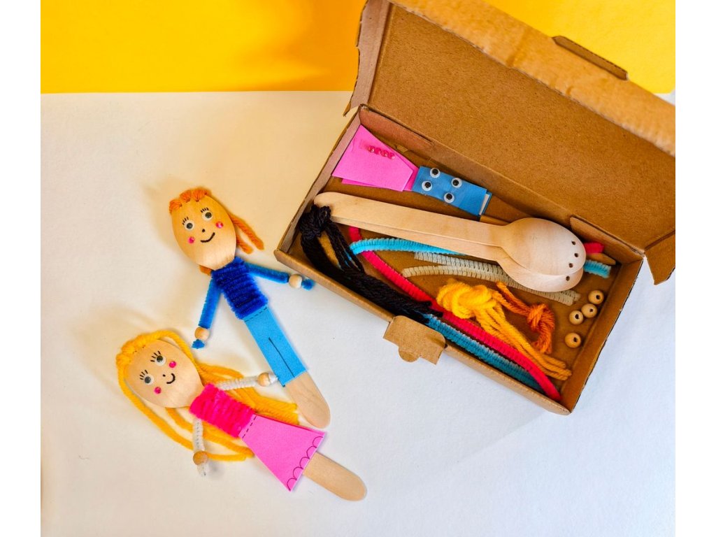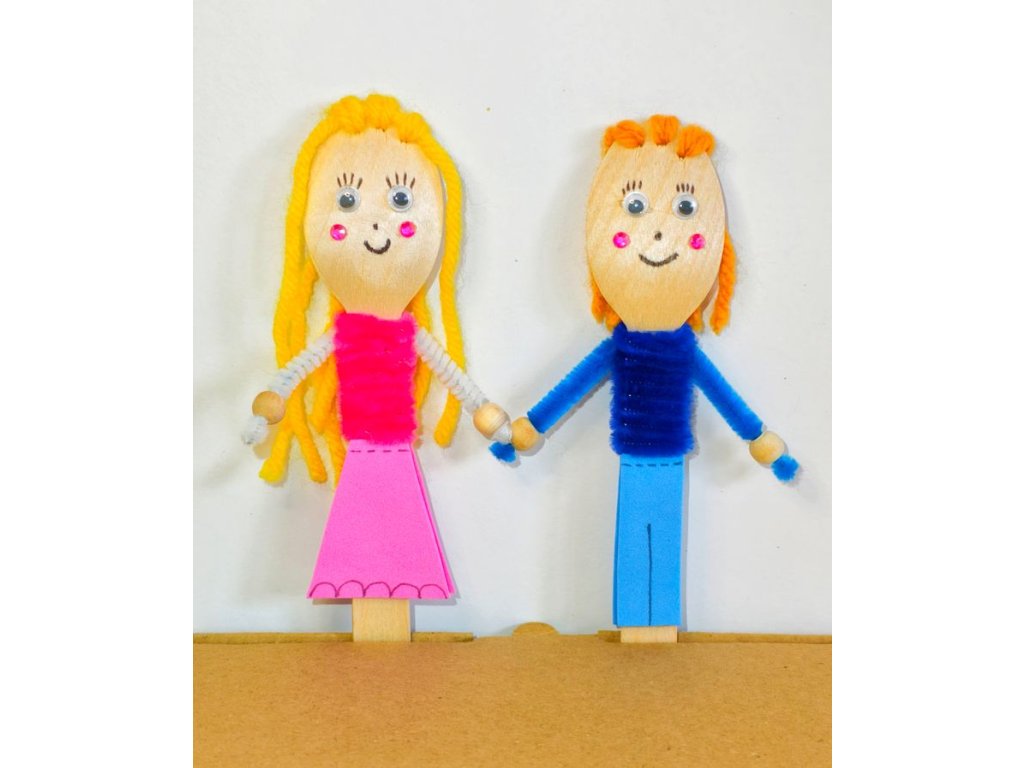 Vyrobíme si dvě krásné 16 cm velké postavičky z dřevěných lžiček - holčičku a chlapečka - na výběr jsou při tom tři barvy vlny na vlásky - žlutá, hnědá a černá.