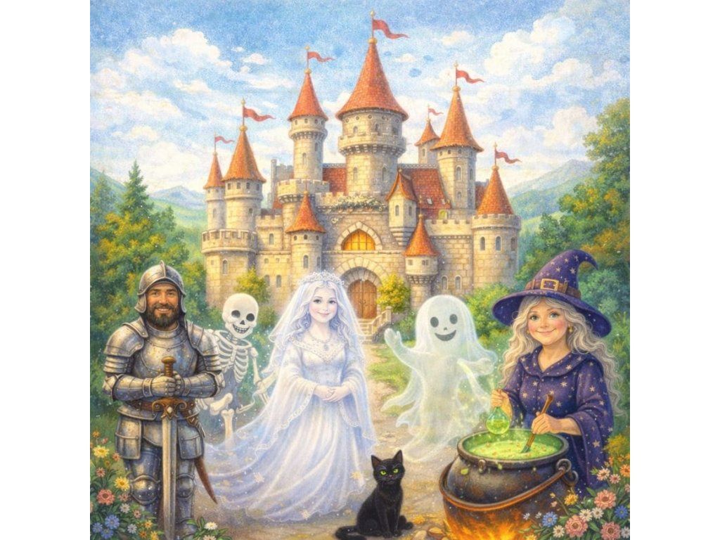 Tři děti se zdrží při prohlídce hradu u obrazu Bílé paní, protože se jim zdá, že na ně pomrkává. Jejich skupina zatím z hradu odejde a kastelán hrad zamkne. Strašidla, která se na hradě nudí, tato situace potěšila a vymyslí pro děti úkoly. Za každý splněný úkol dostanou děti malou odměnu a nakonec jim strašidla odemknou tajnou zadní branku, aby se děti mohly vrátit domů.